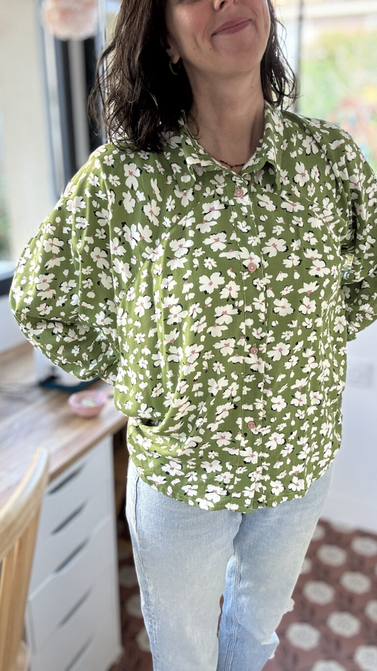J’ai cousu La Chemise d’Atelier Brunette, une base de chemise boyfriend revisitée : une coupe très loose très confortable, un petit col français et une découpe biseau sur le devant.